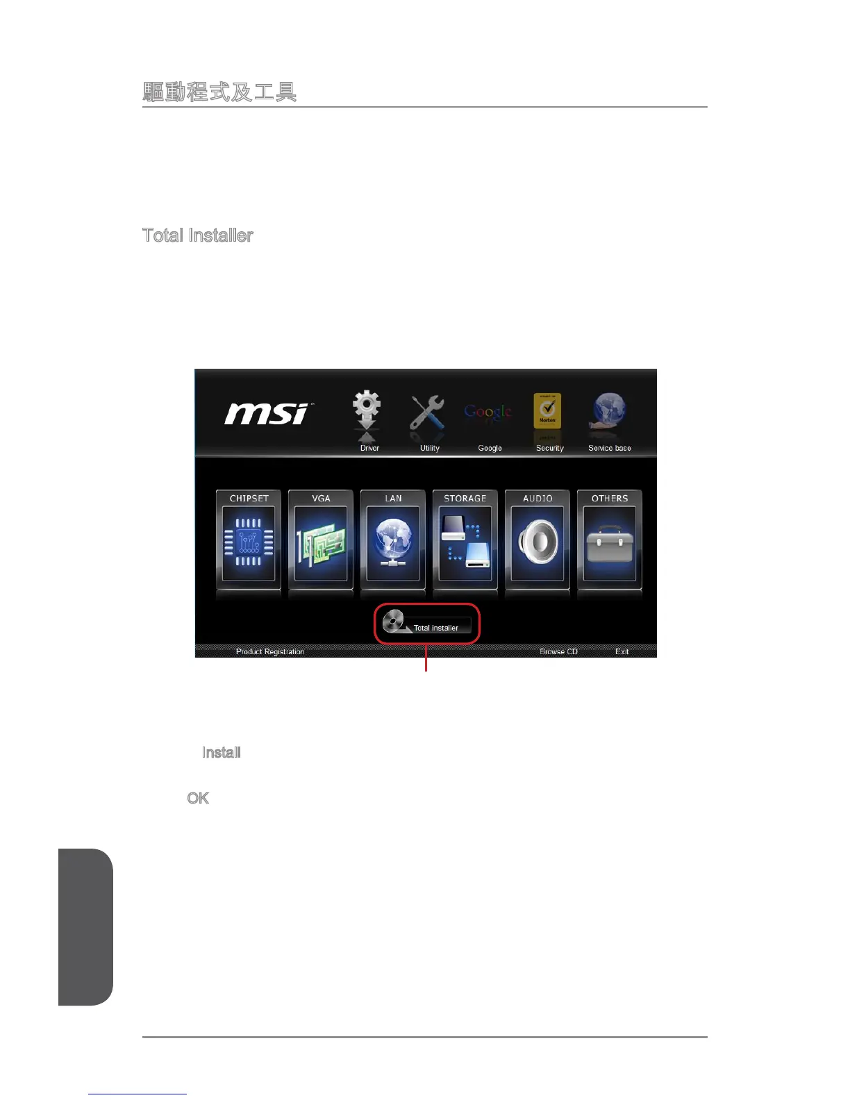 將 MSI 驅動程式光碟放入光碟機。若在作業系統下放置,設定畫面會自動跳出。