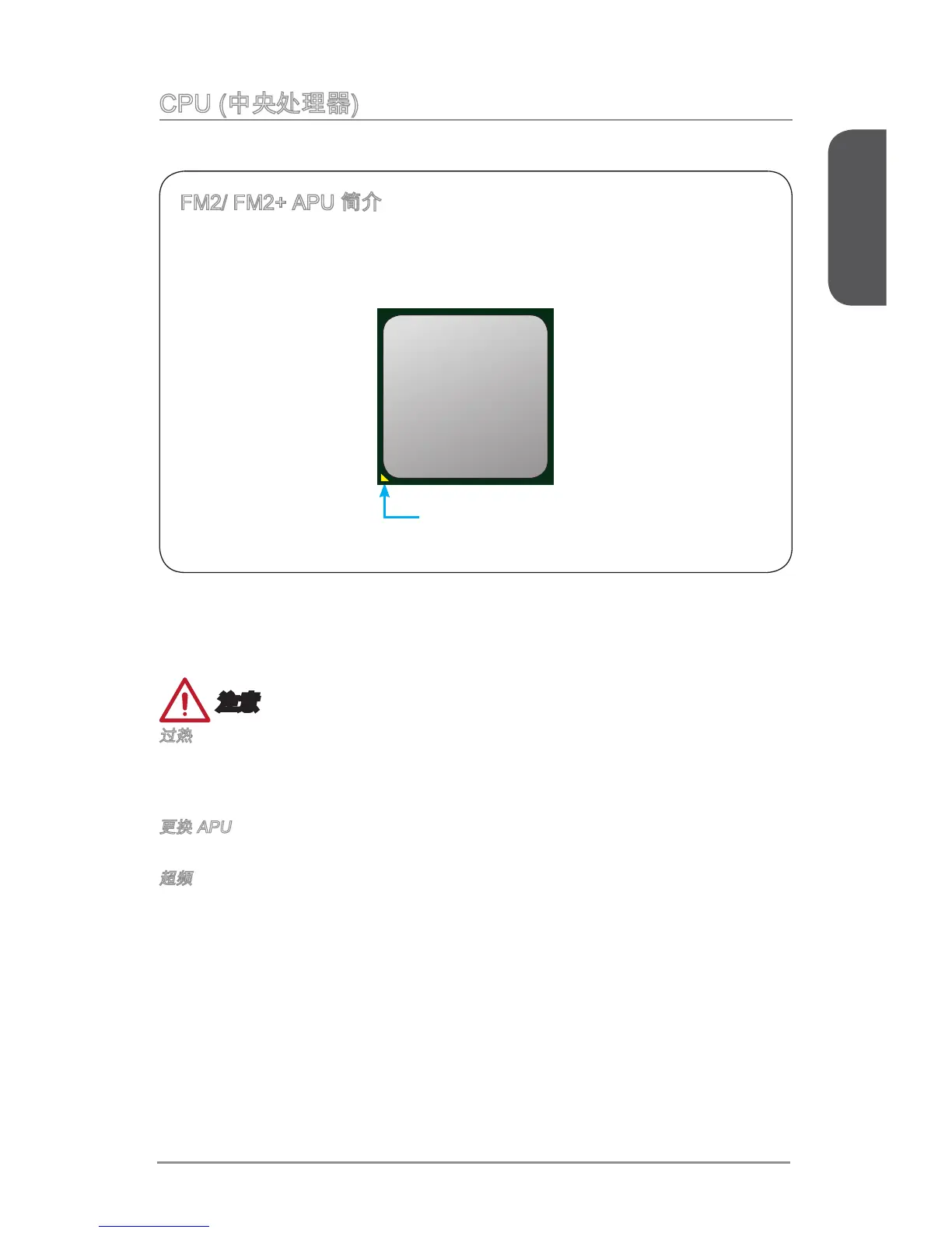 FM2/ FM2+ APU 的表面有一个金色的三角形,用来帮助您将 APU 正确的放置