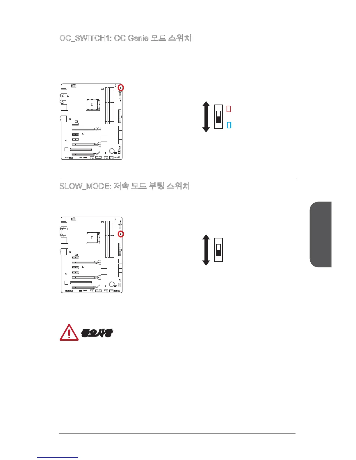 이 스위치는 두가지 오버클로킹 모드(Gear 1과 Gear 2)를 제공합니다. OC Genie 버튼