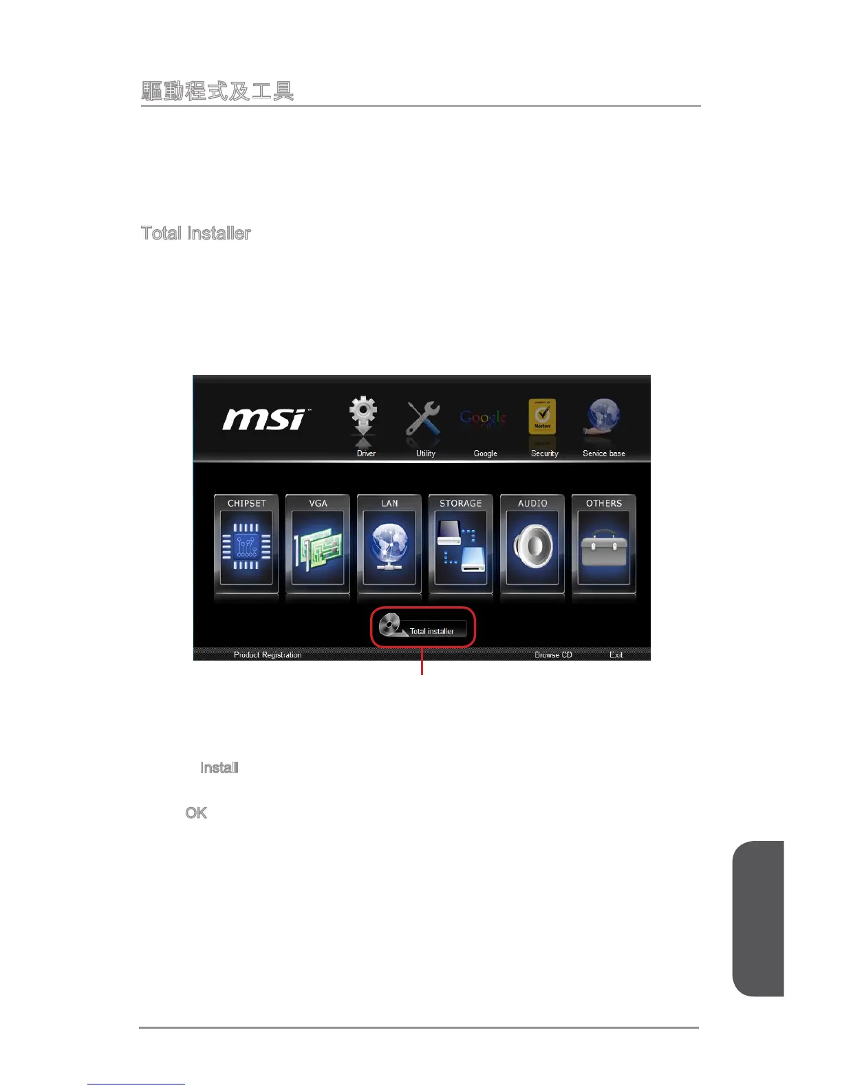 將 MSI 驅動程式光碟放入光碟機。若在作業系統下放置,設定畫面會自動跳出。