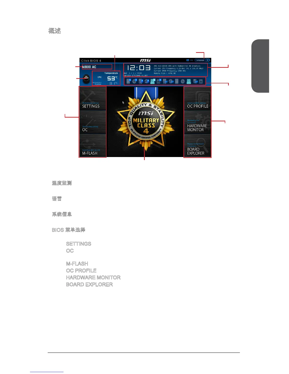 显示时间,日期,CPU 名称, CPU 频率,DRAM 频率,DRAM 容量和 BIOS 版本。