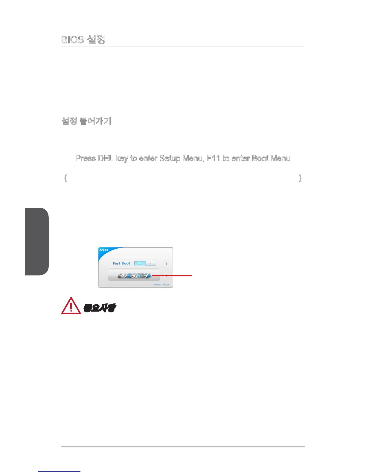 MSI는 BIOS 설정 화면으로 이동하는 방법을 추가적으로 제공합니다. "MSI Fast Boot"