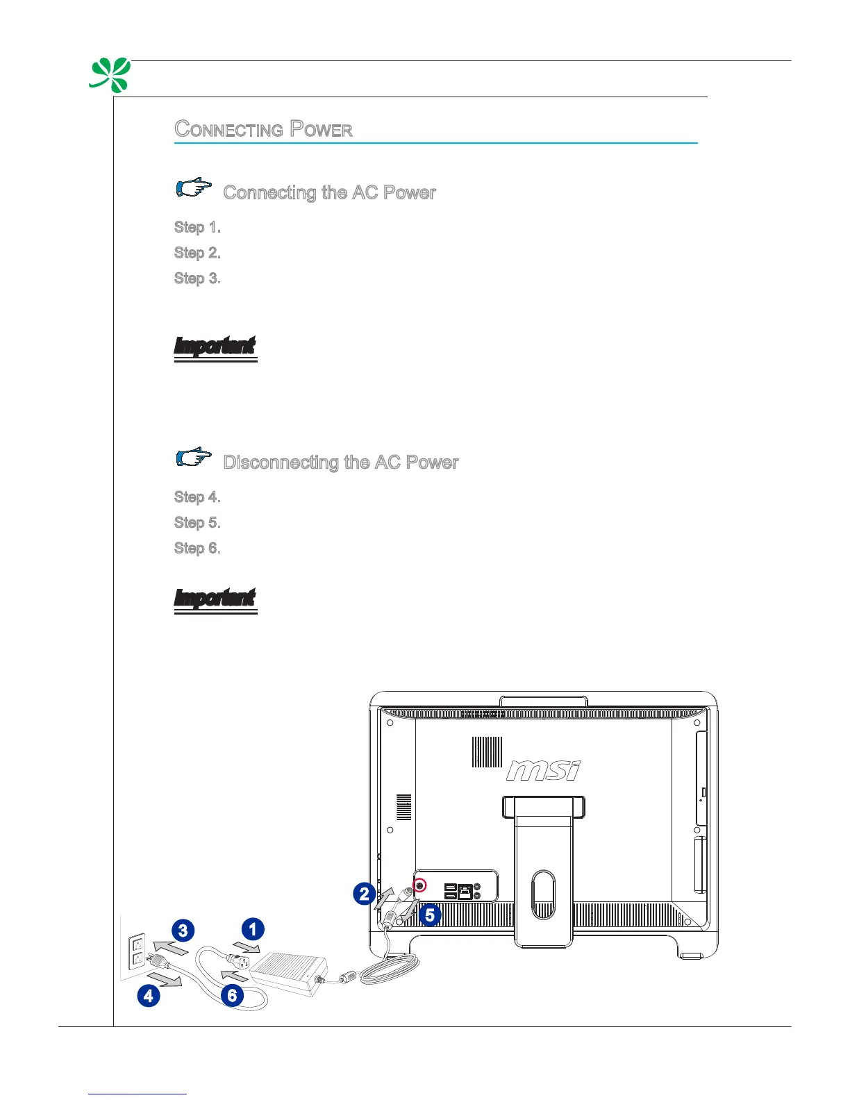 We suggest that you connect the AC/DC adapter to your AIO PC rst and then