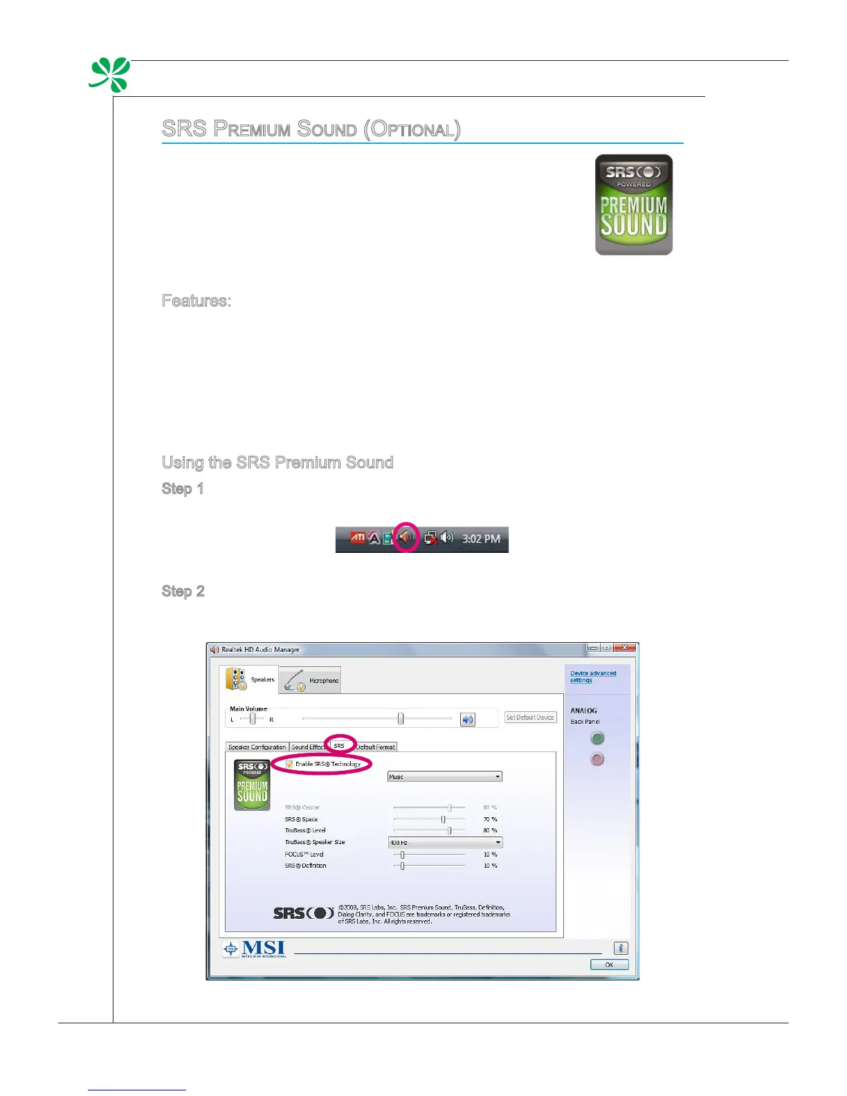 Step 2. The Realtek HD Audio Manager pops up. Click the SRS tab and check