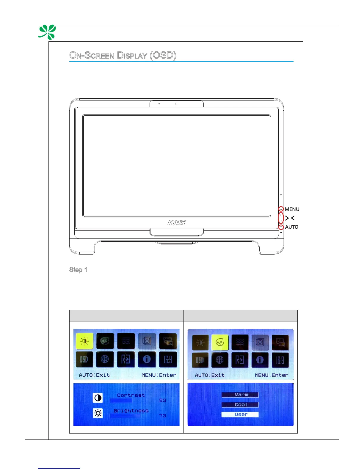 The on-screen display (OSD) allows you to tune the viewing options of the moni-