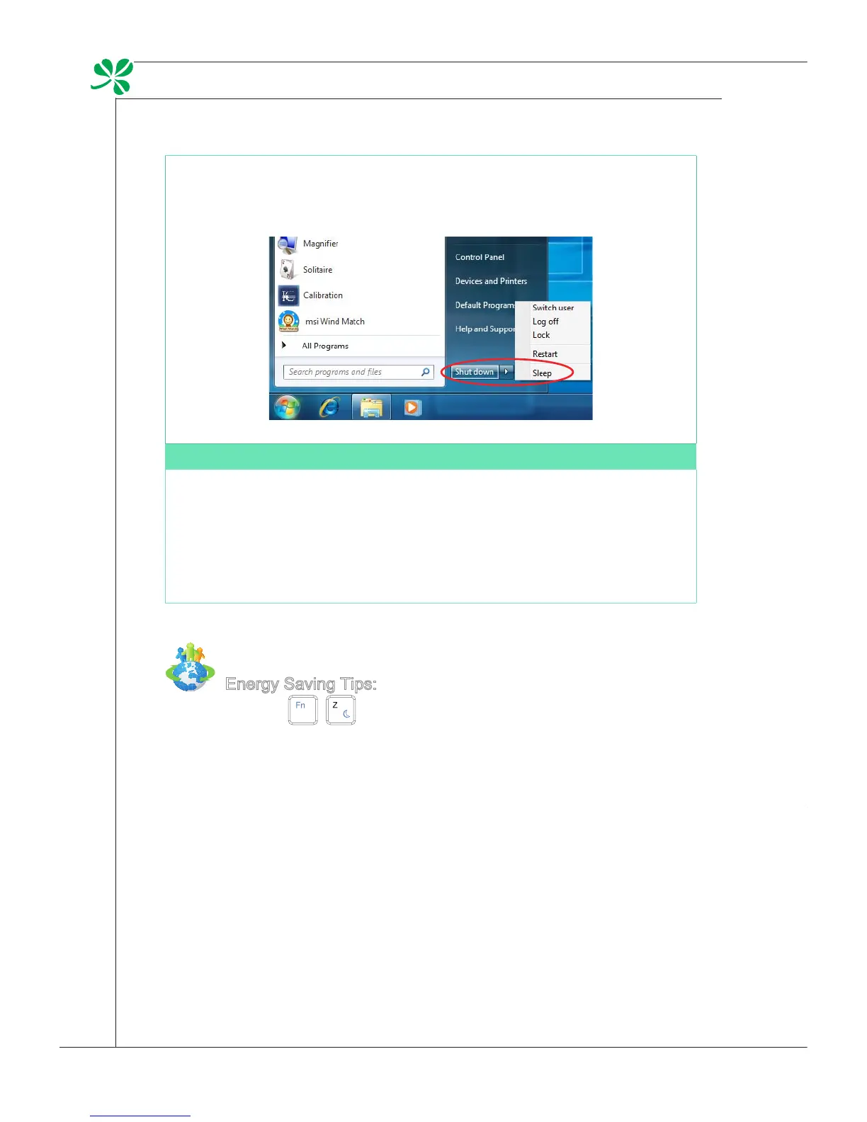 Utilize the (Fn + Z) sleep mode keys to turn into power saving