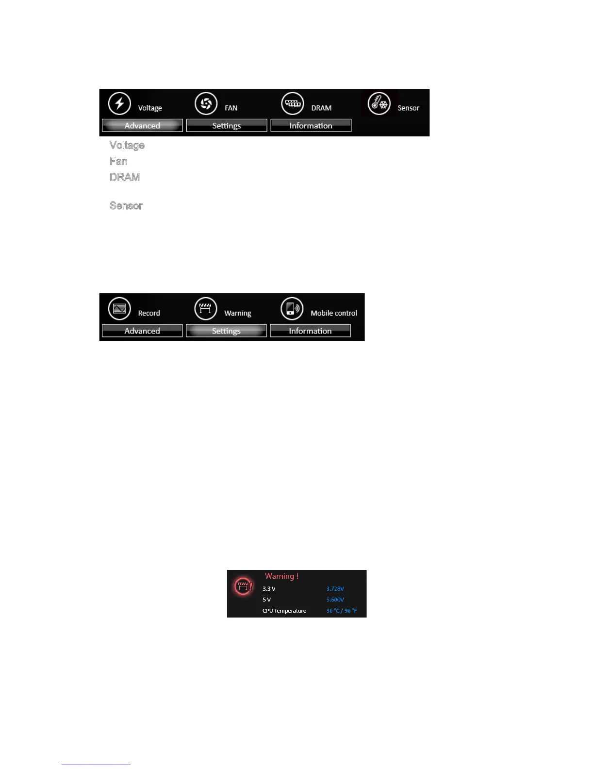 ● Warning - contains fields of voltage, fan speed and temperature for you to set the