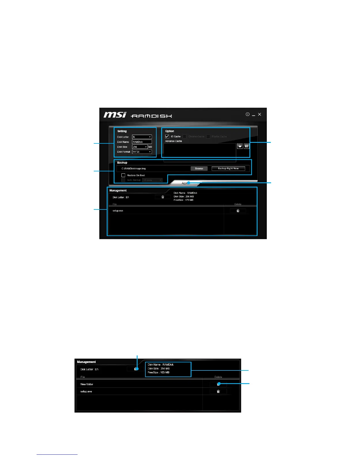 ● Management - shows RAMDISK information and allows you to delete files.