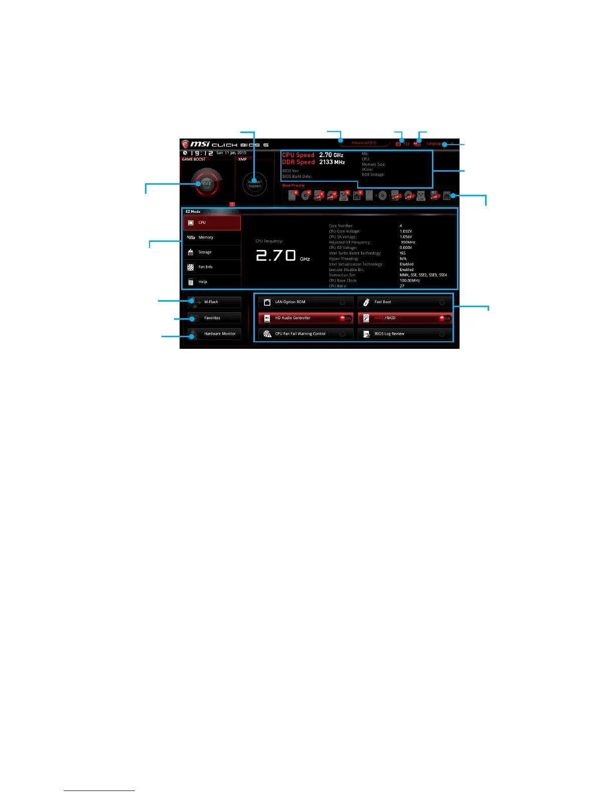 y System information - shows the CPU/ DDR speed, CPU/ MB temperature, MB/ CPU