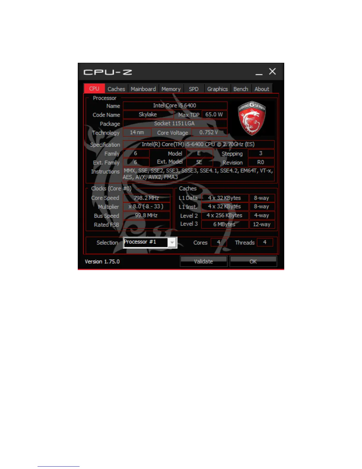 y CPU Tab - shows processor name, code name, package, specification, instructions