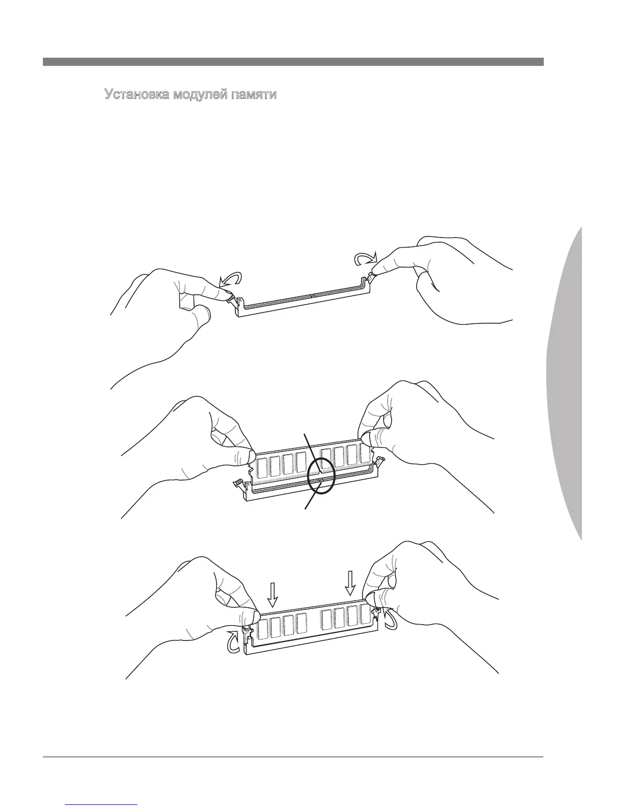 жении модуля памяти в гнезде пластиковые защелки с обеих сторон гнезда
