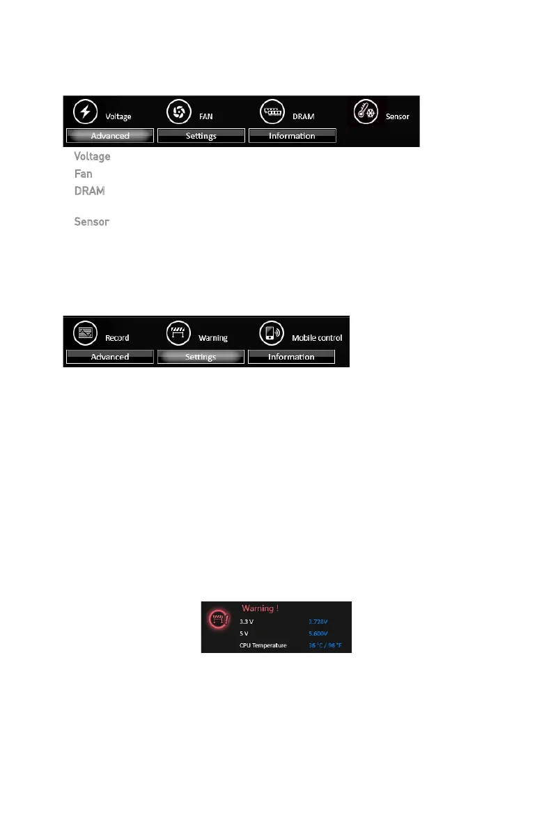 When click the Advanced button, The Voltage, Fan and DRAM icons will appear.