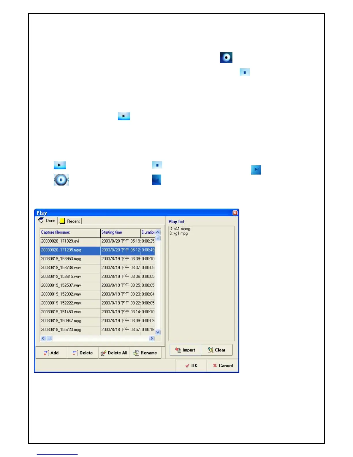 Note: The window above is an example of adding or deleting files to and from the play list.