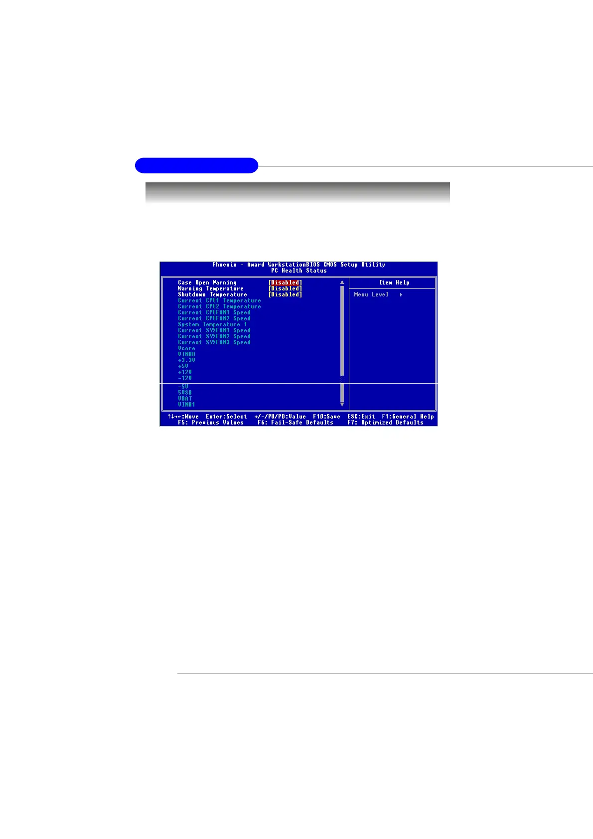CPUFAN1/2 SYSFAN1/2/3 Speed, Vcore, VINR0, +3.3V, +5V, +12V, -