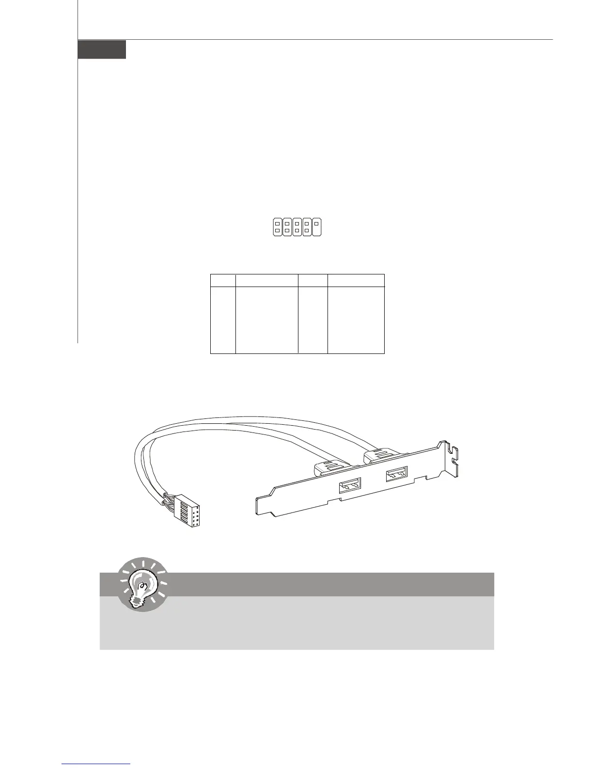 The mainboard provides one USB 2.0 pinheader (optional USB 2.0 bracket available)