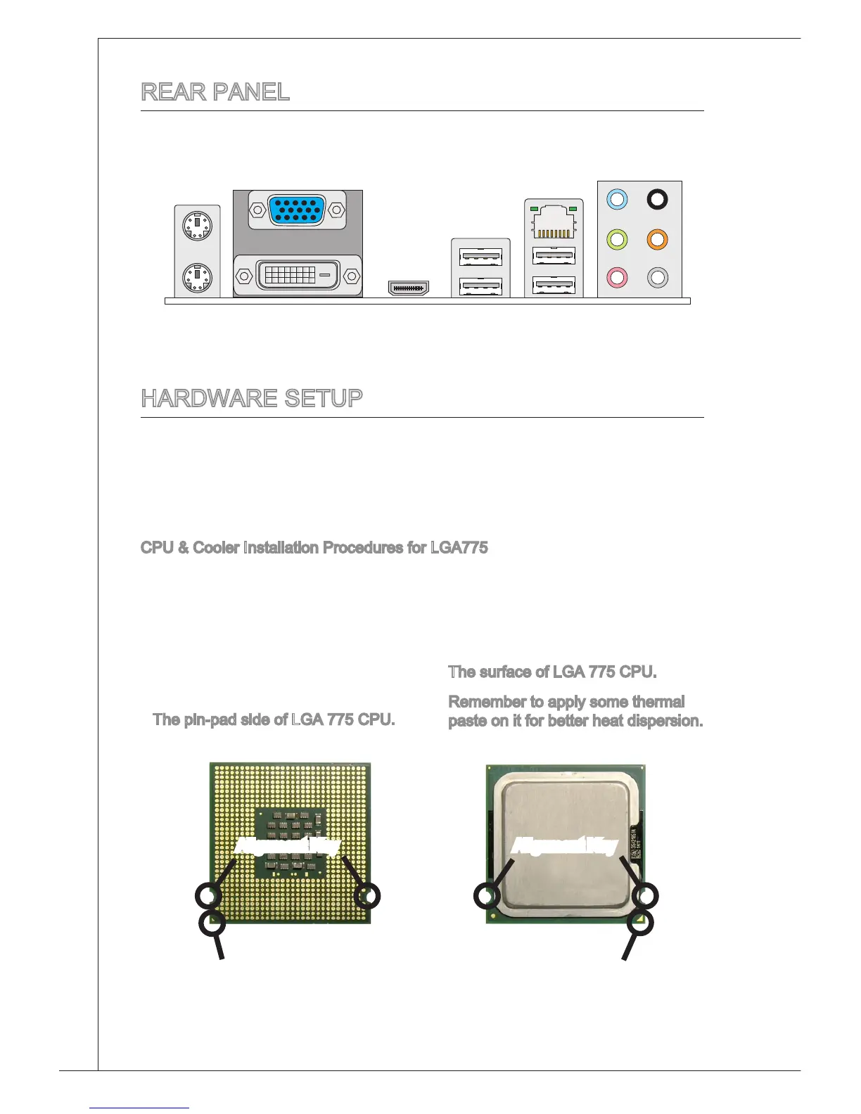 MSI G4M-e43 - CPU & Cooler Installation; Hardware Setup; Rear Panel