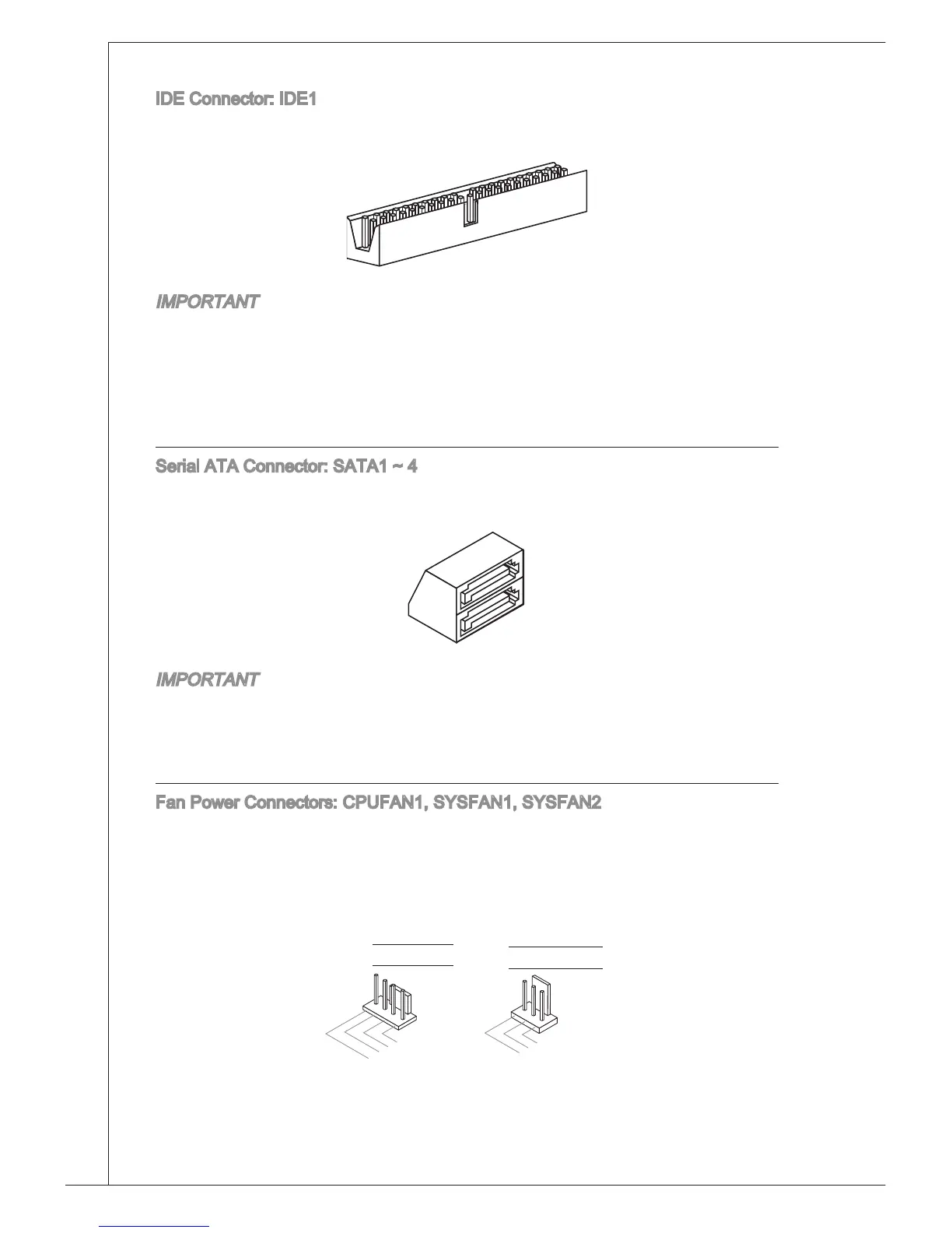 MSI G4M-e43 - Fan Power Connectors: Cpufan, Sysfan, Sysfan2; Ide Connector: Ide; Serial Ata Connector: Sata ~ 4