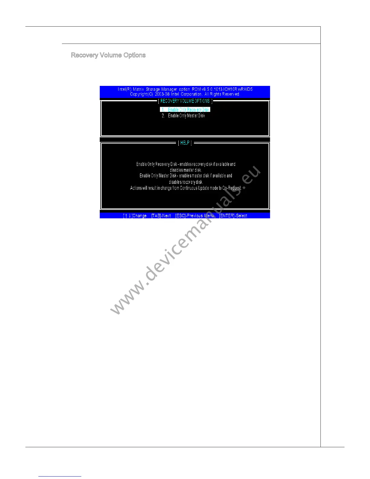Select opton 4 Recovery Volume Optons and press <Enter> to change recovery