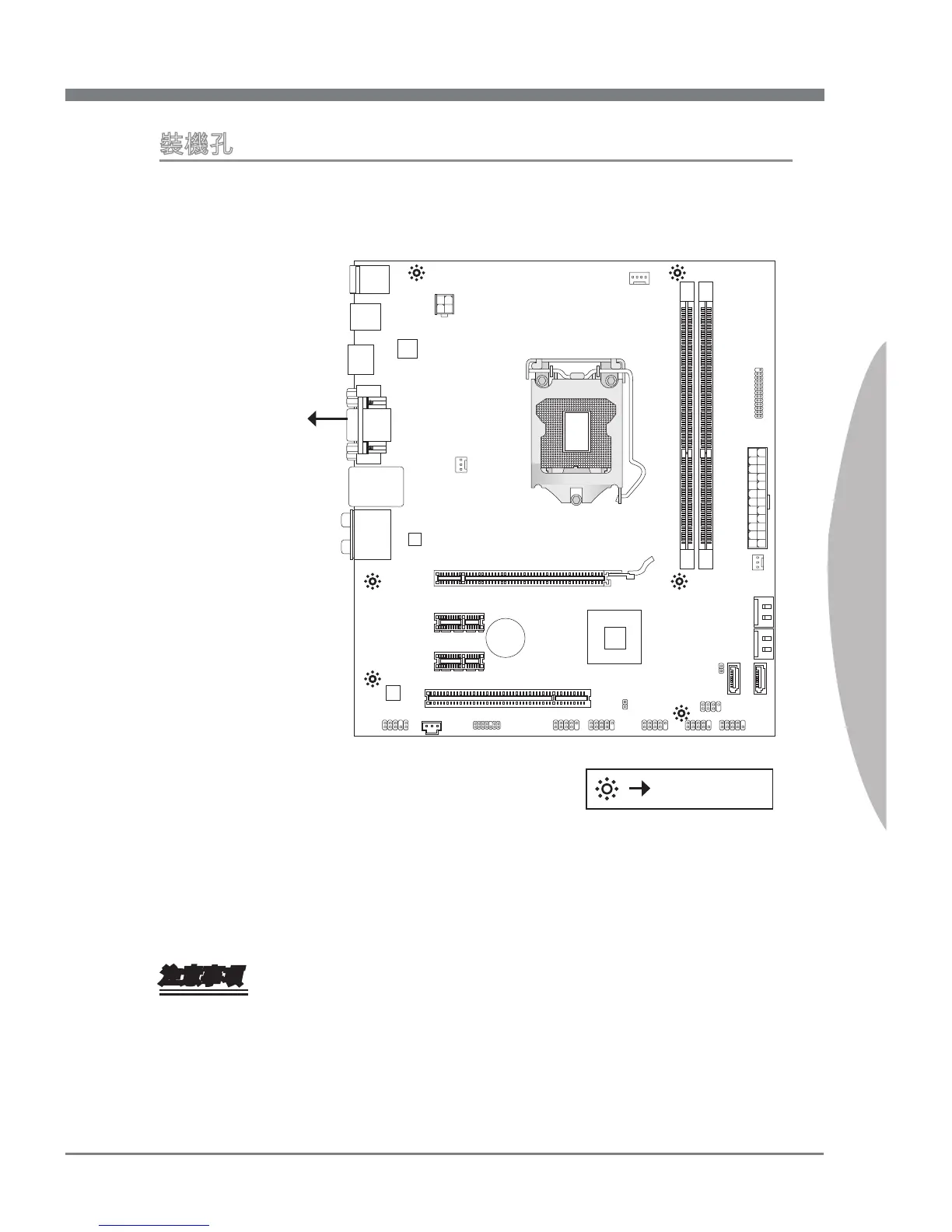 安裝主機板時,務必以正確方向將主機板放至機殼內。主機板上裝機孔位置如下圖所
