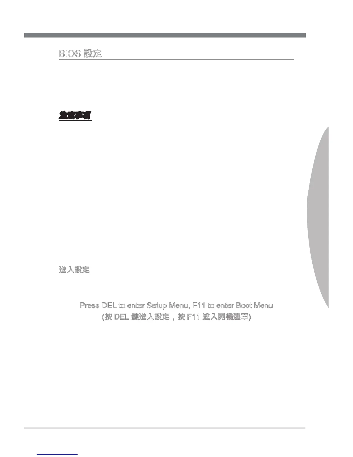 開機後,系統就會開始POST (開機自我測試) 程序。當下列訊息出現在螢幕上時,請按