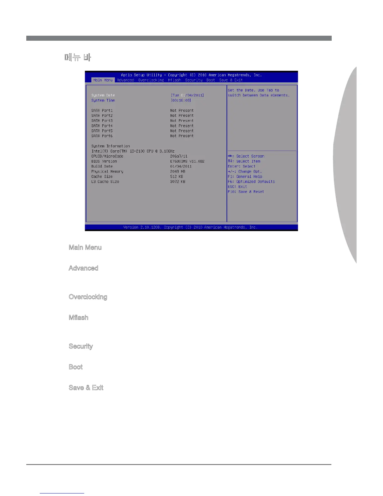 이 메뉴를 사용하여 BIOS 기본 값이나 설정을 BIOS에 로드하고 BIOS 설정 유틸리티를