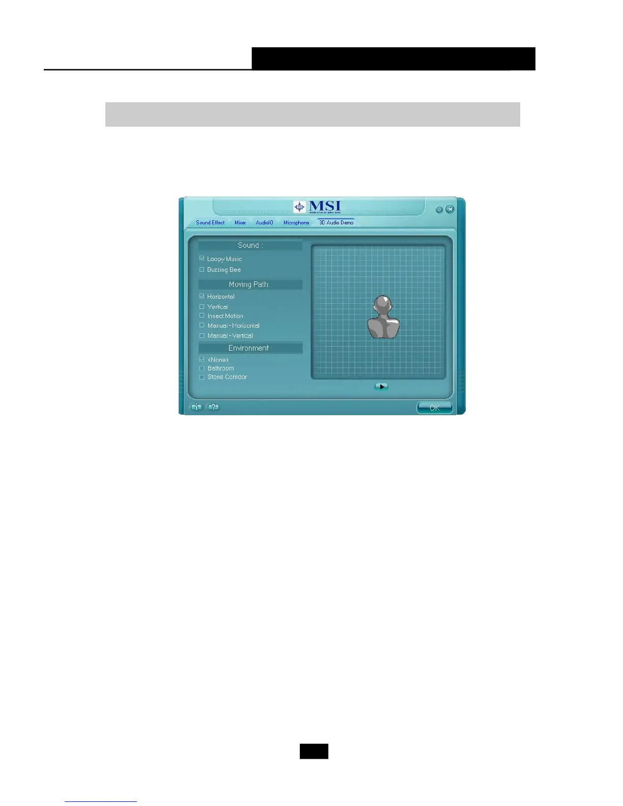 In this tab you may adjust your 3D positional audio before playing 3D audio