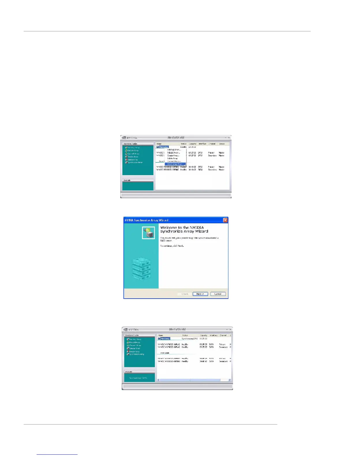 NVRAIDMAN window indicates that the array is synchronizing, as shown in Fig-