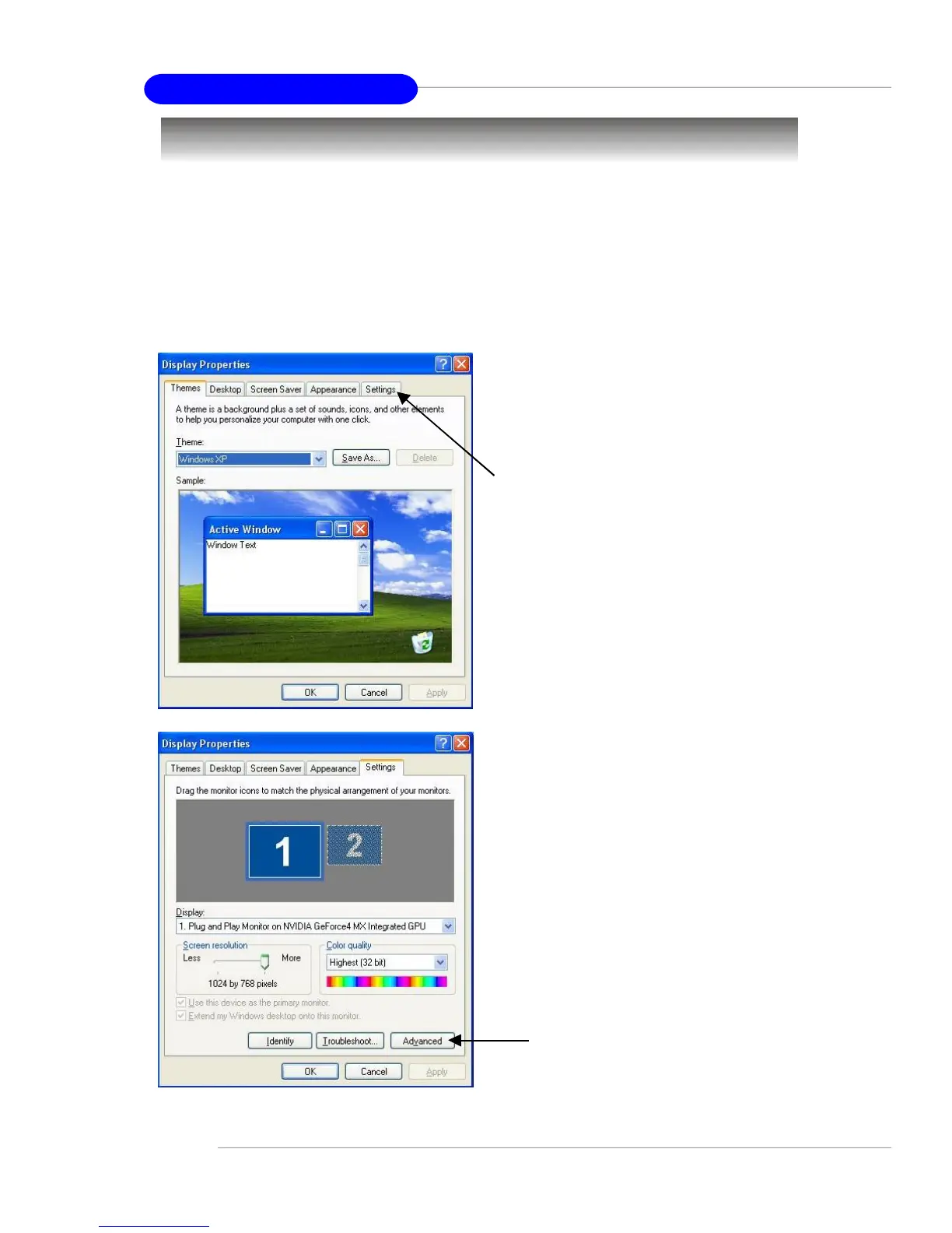 The following procedures describe display setup using Windows XP. Windows