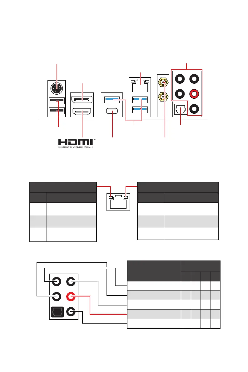 MSI MAG B460M MORTAR - Lan 포트 Led 상태 표시; 오디오 포트 구성 도표; 후면 I;O 패널