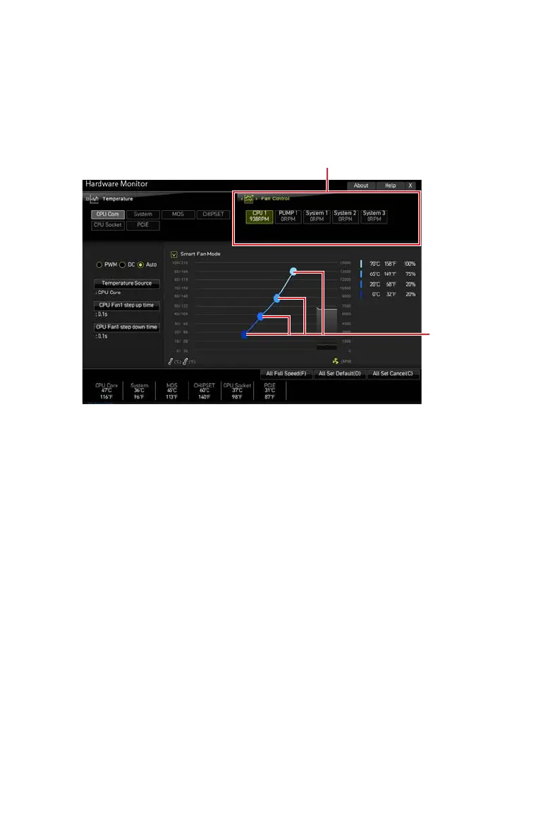 1. Selects a fan that you want to adjust and to display the fan duty curve line (yellow)