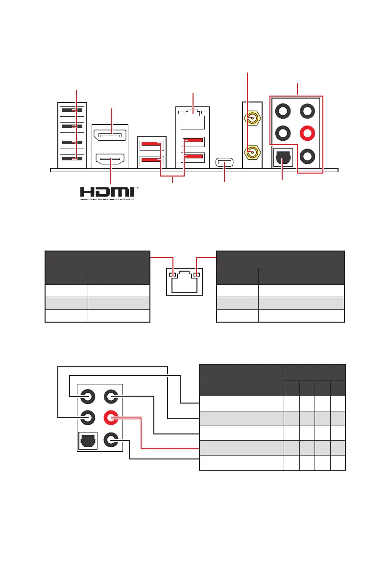 MSI MAG B660 TOMAHAWK EVA e-PROJECT - 網路連接埠 Led 燈狀態表; 背板 I;O; 音效連接埠設置