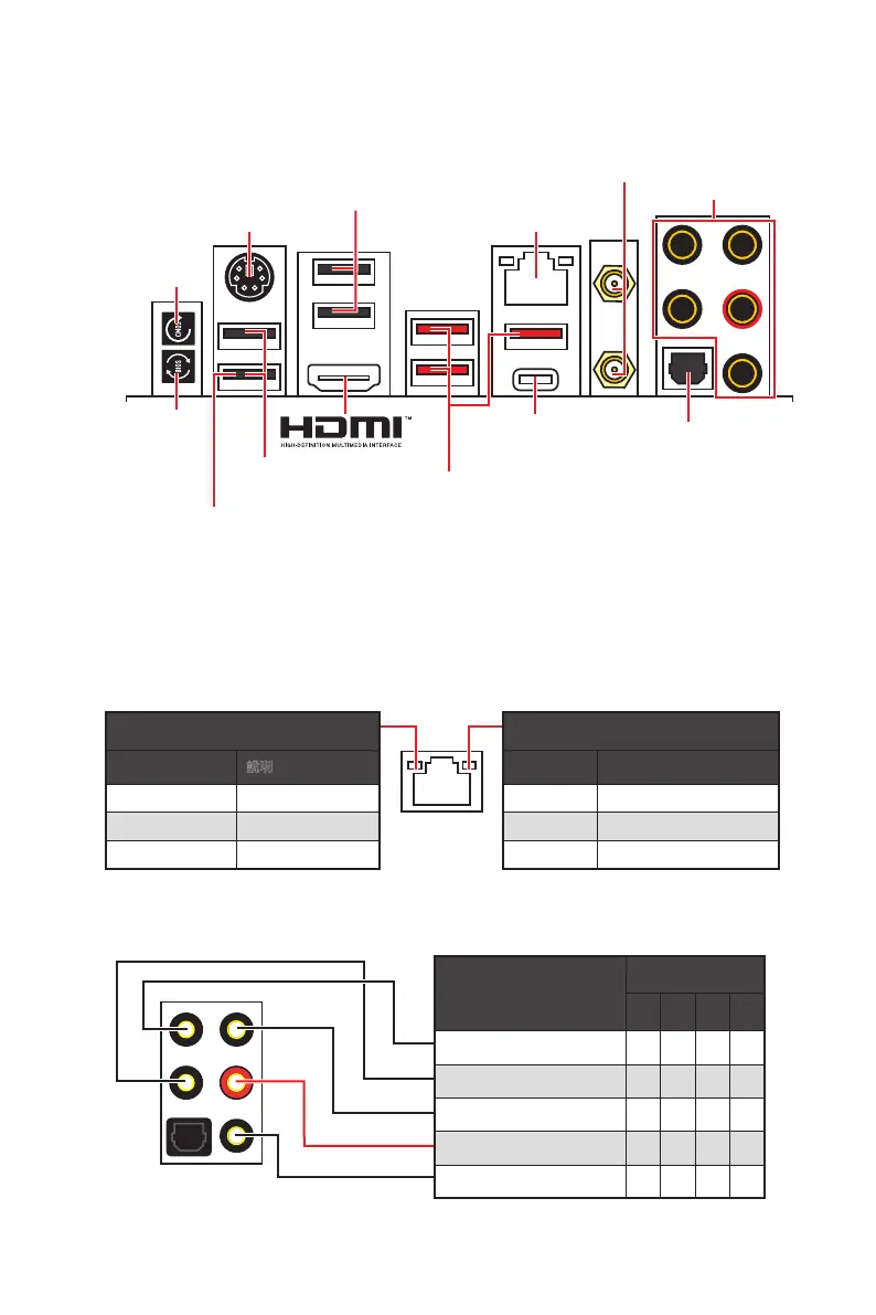 MSI MEG B550 UNIFY - 網路連接埠 Led 燈狀態表; 背板 I;O; 音效連接埠設置
