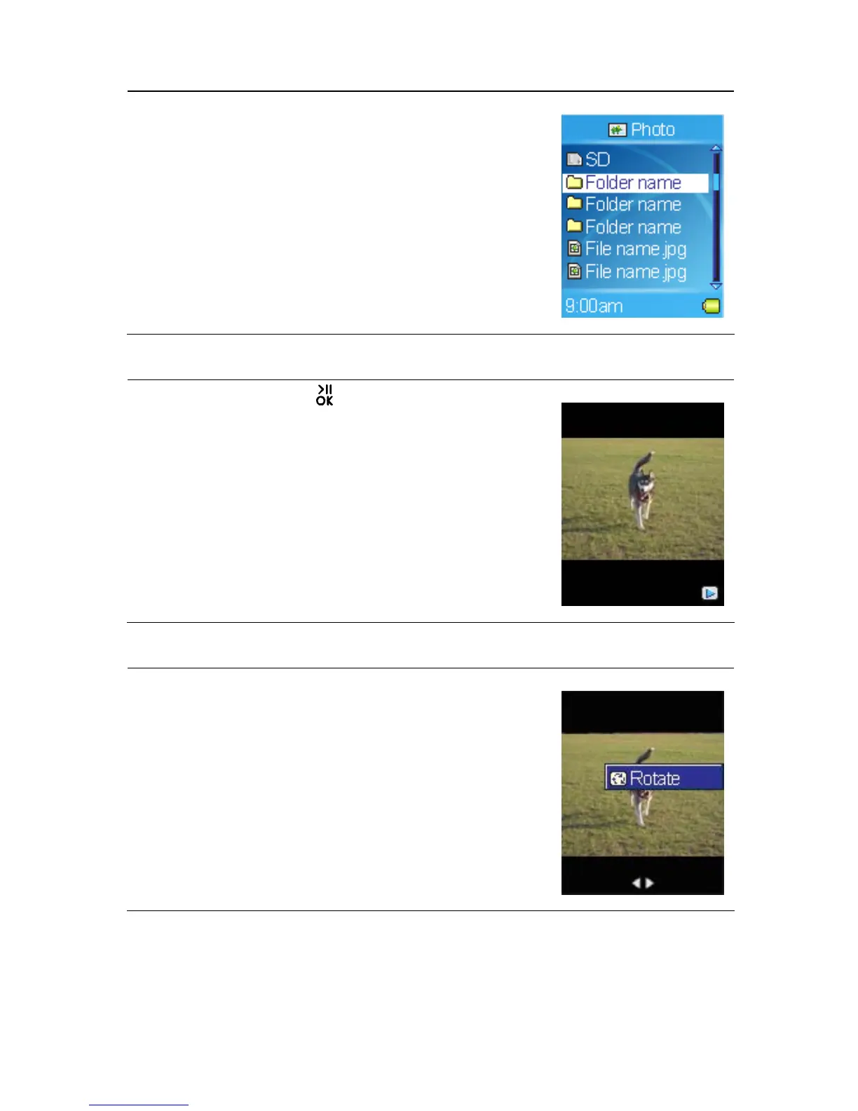 To rotate photos, call submenu while viewing photos,