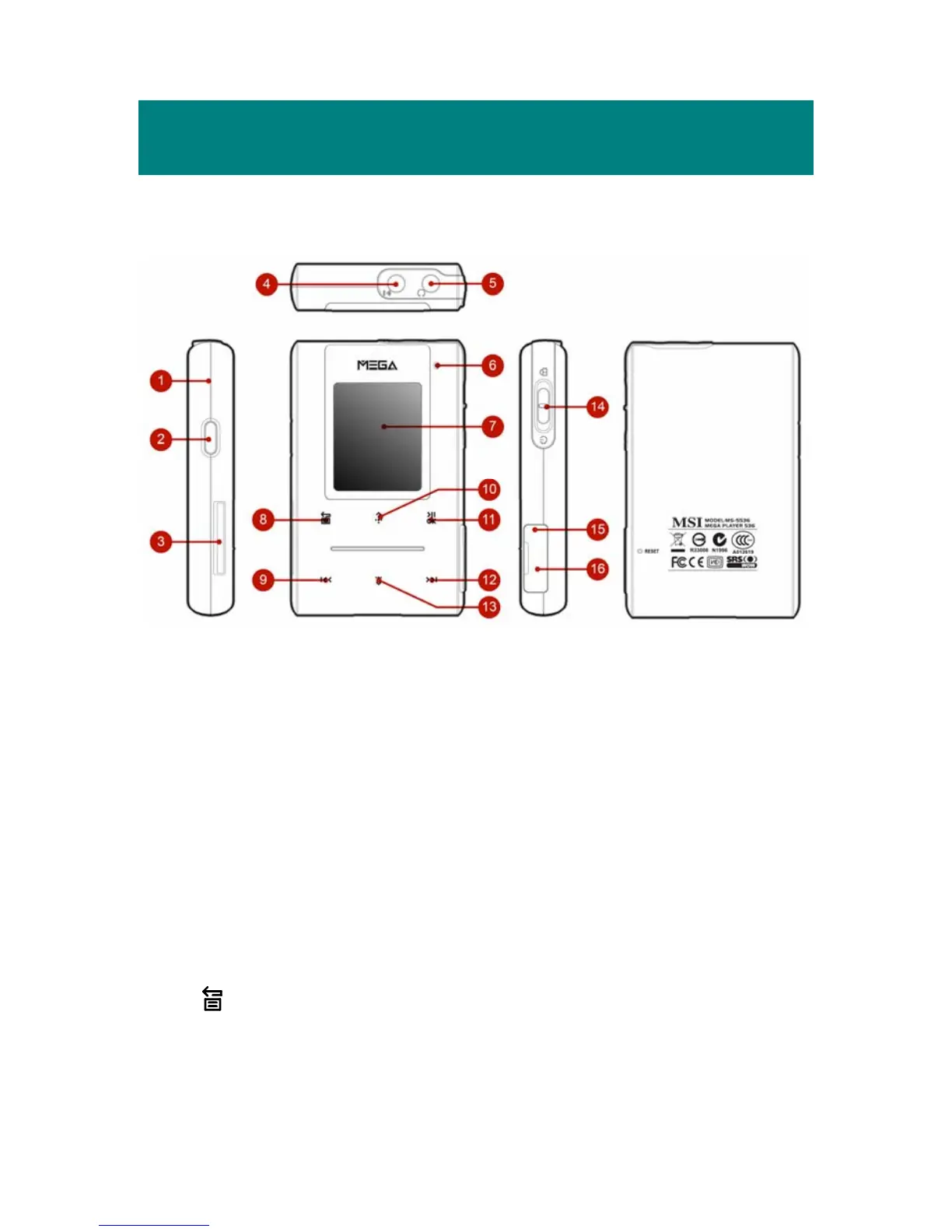 5. Earphone Jack Plug the supplied earphone here.