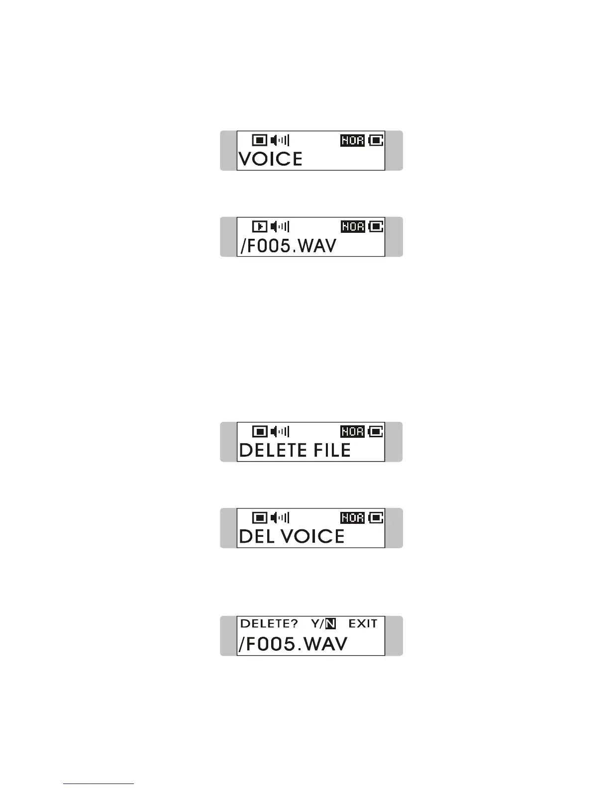 1. To delete a recorded FM voice File, press down Menu button once, and push