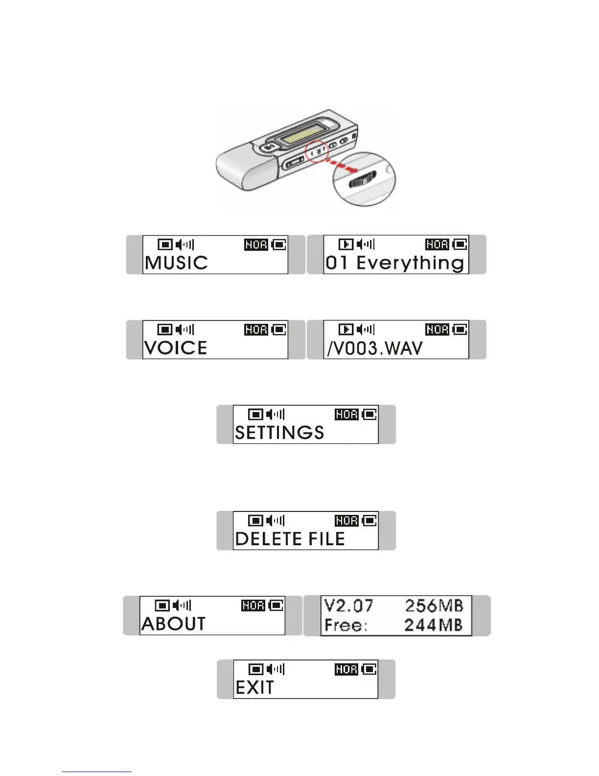 5. Select DELETE FILE by pressing Menu button to delete music or voice files.