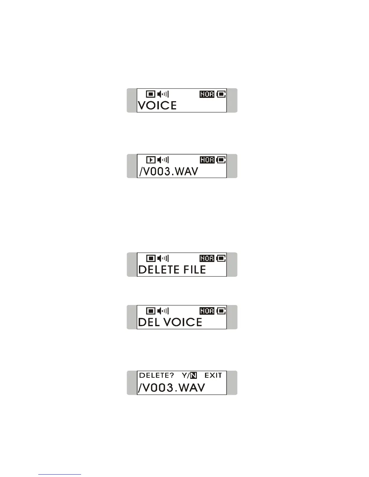 1. To delete a recorded voice File, press Menu button once, and push Menu