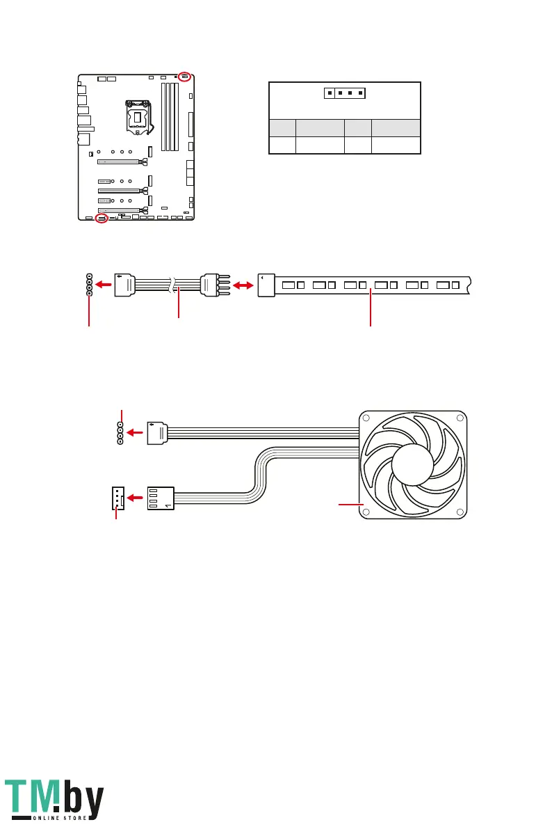 Le connecteur JRGB supporte des rubans LED RGB (12 V/G/R/B) de type 5050 d’une