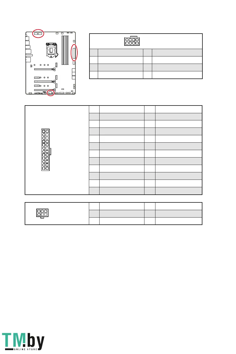 CPU_PWR1~2, ATX_PWR1, PCIE_PWR1: Stromanschlüsse