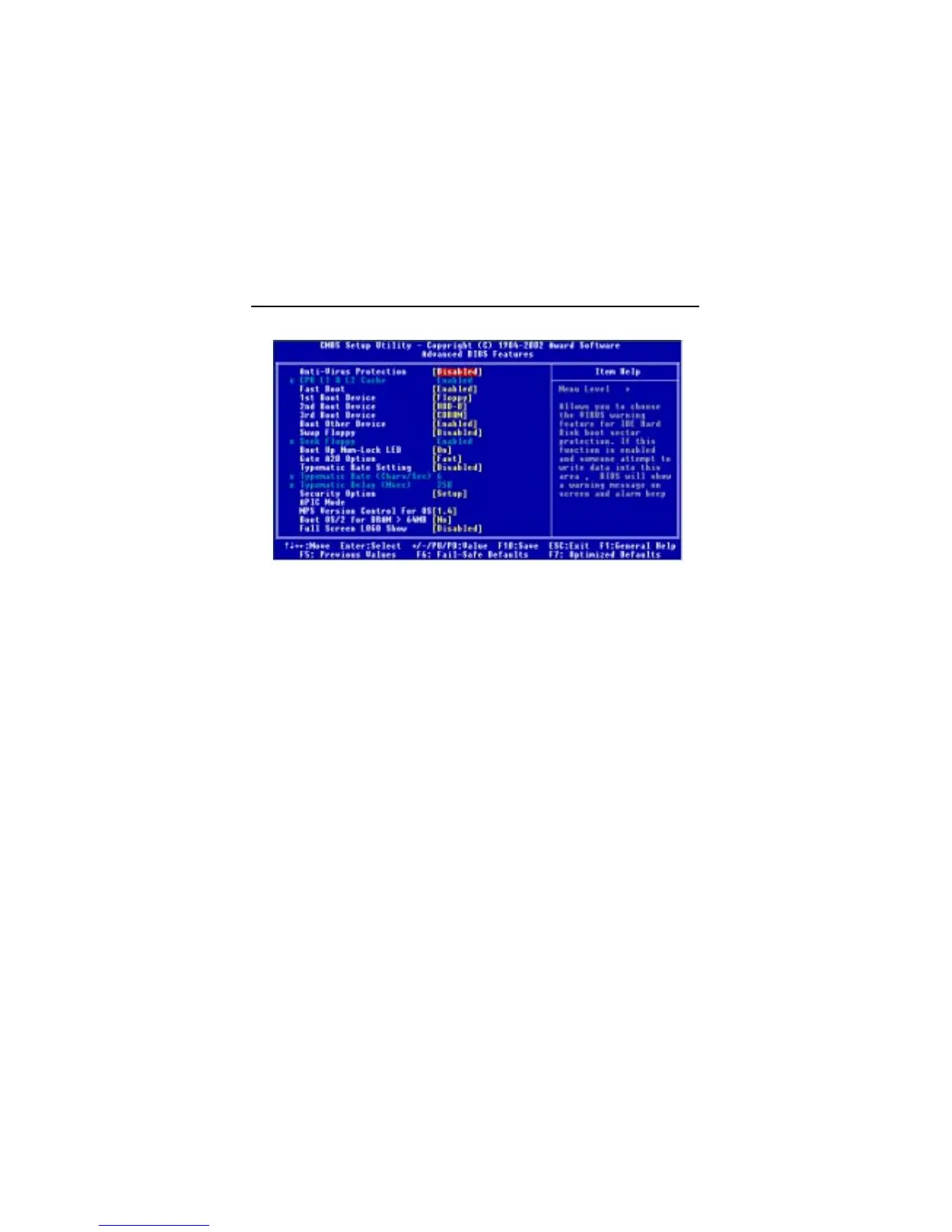 area is made, BIOS will display a warning message on screen and beep. Settings: