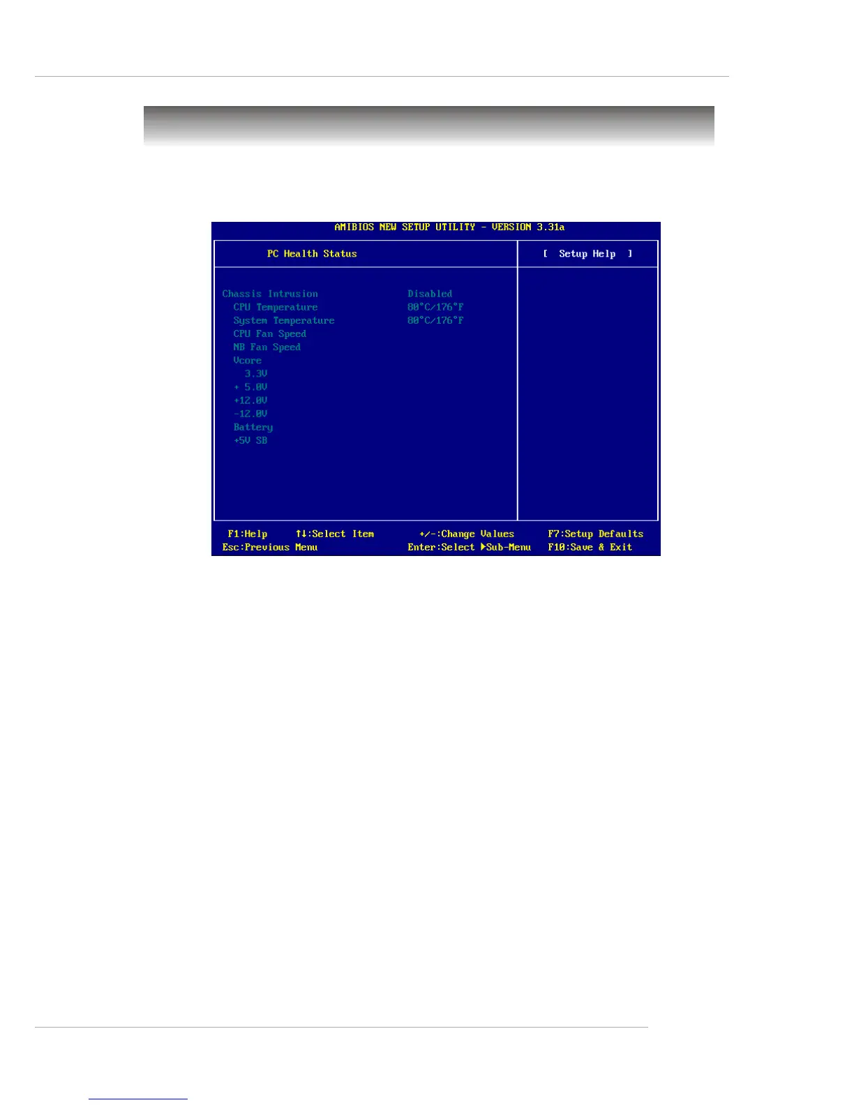 CPU/System Temperature, CPU/NB Fan Speed, Vcore, 3.3V, +5.0V, +12.0V,