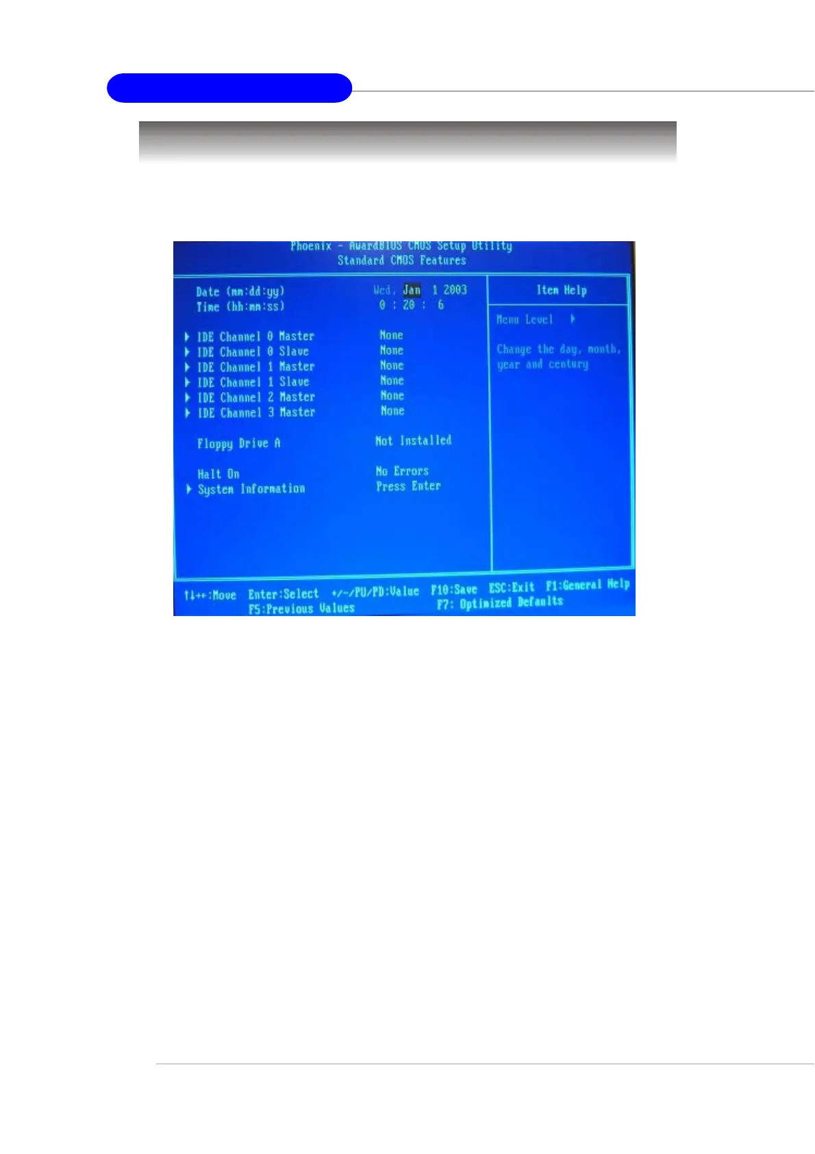The items in Standard CMOS Features Menu includes some basic setup items.