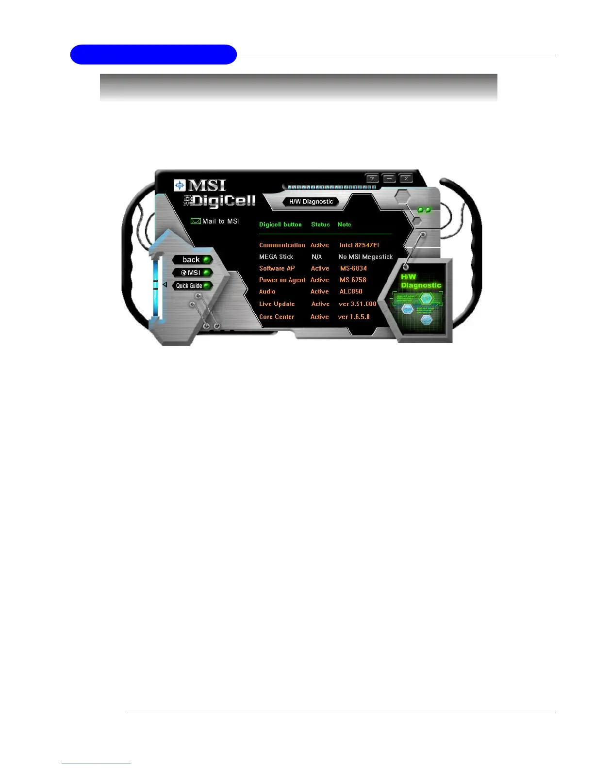 In the H/W Diagnostic sub-menu, you can see the information, status and note of
