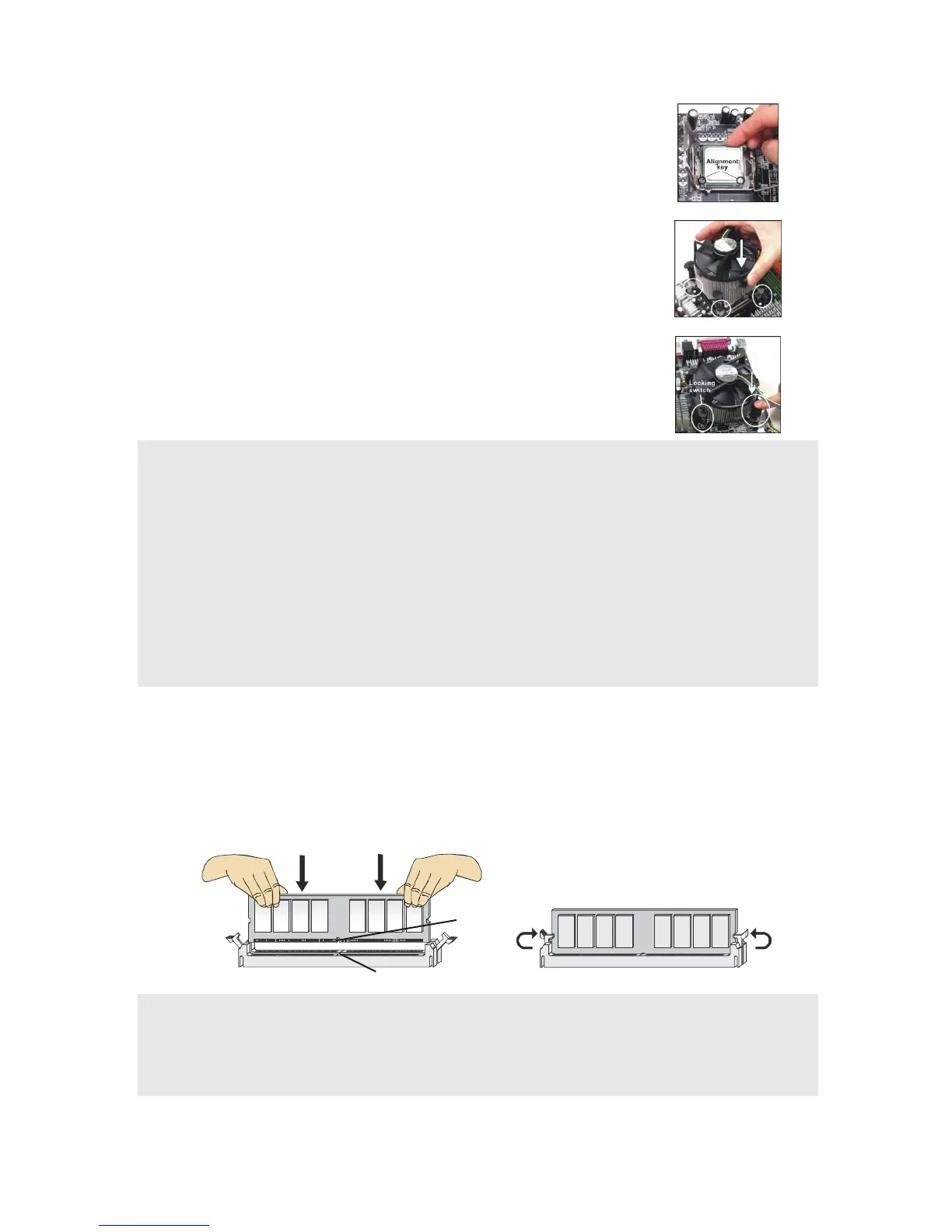 10. 对齐风扇和主板上的安装孔,将风扇用力向下压,直到四个钉