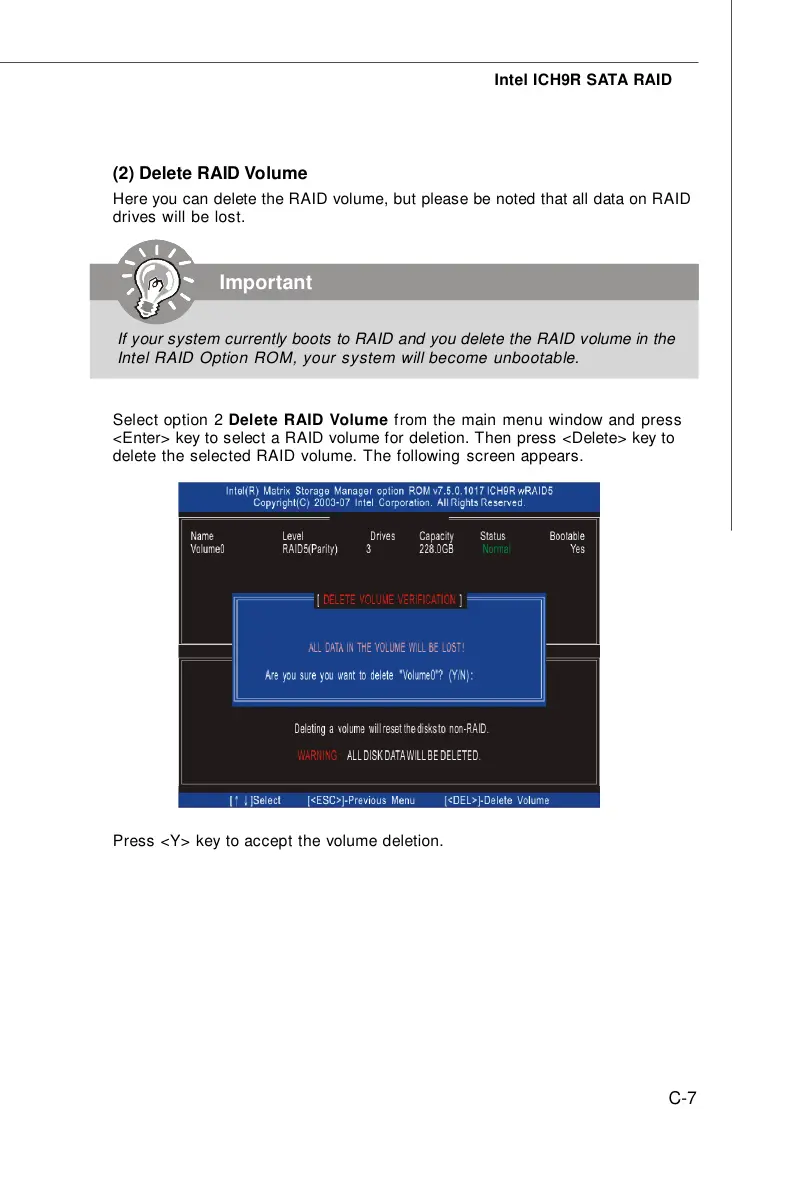 <Enter> key to select a RAID volume for deletion. Then press <Delete> key to