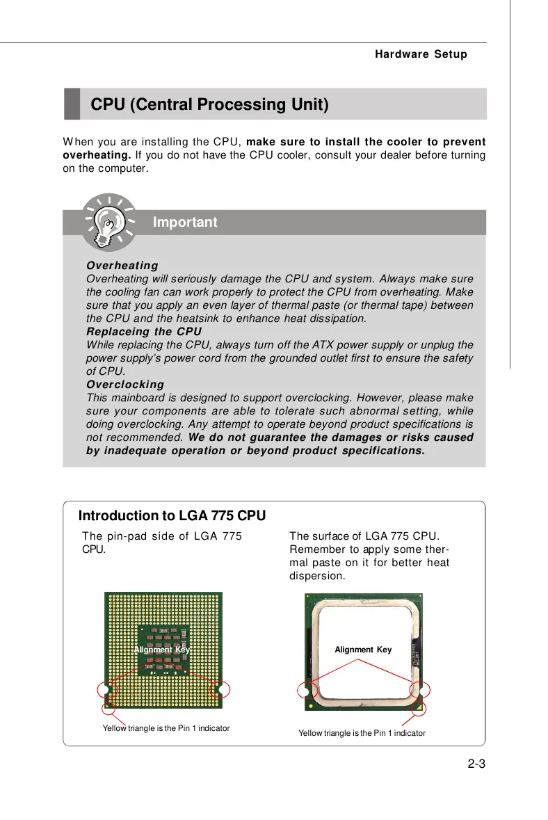 overheating. If you do not have the CPU cooler, consult your dealer before turning