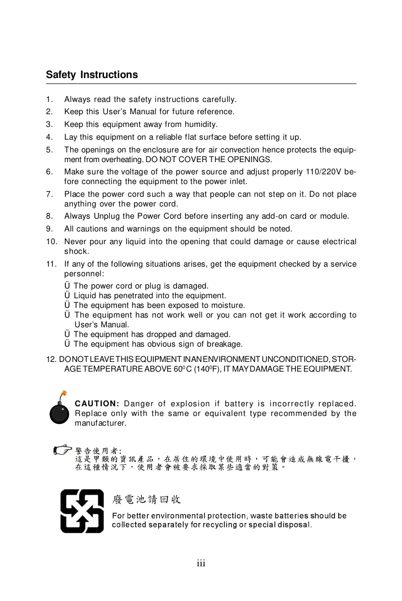8. Always Unplug the Power Cord before inserting any add-on card or module.
