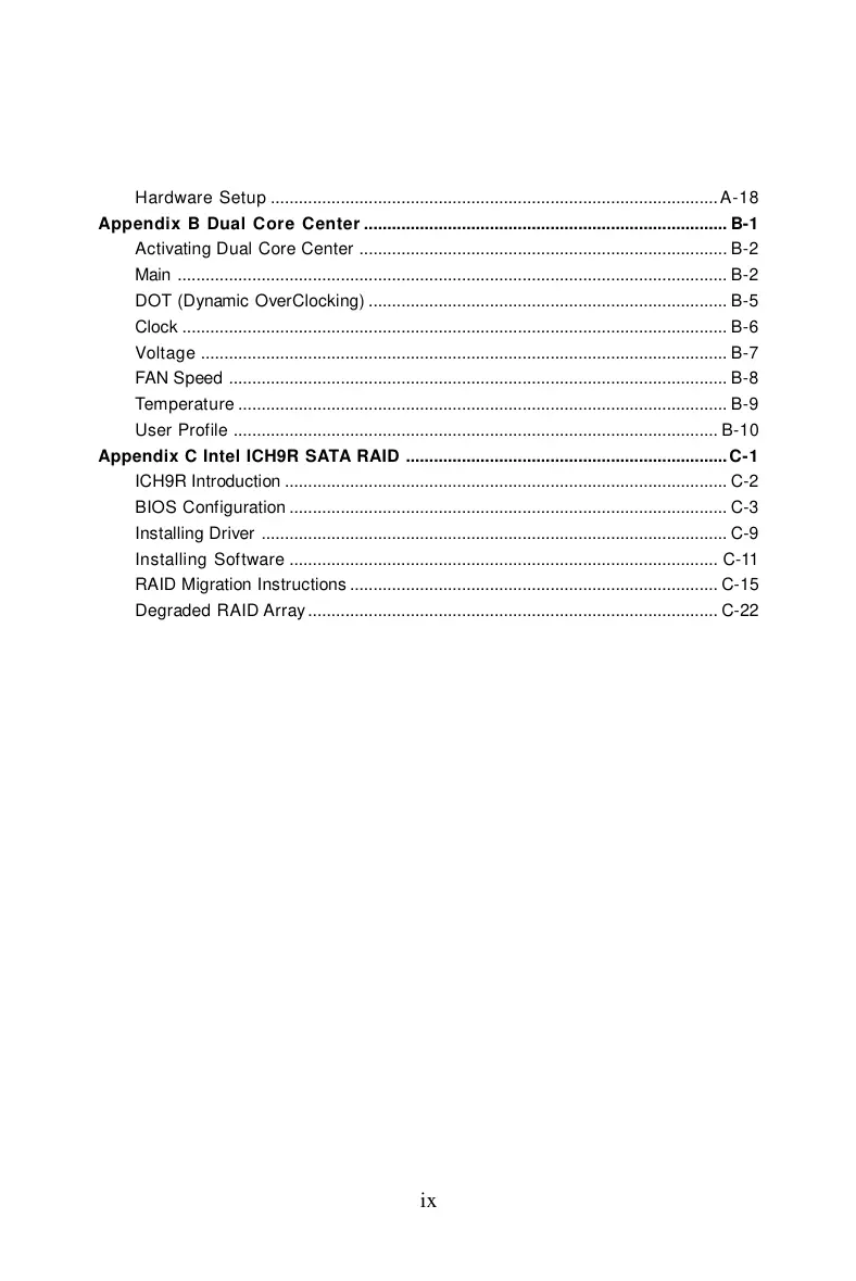 Appendix C Intel ICH9R SATA RAID.....................................................................C-1