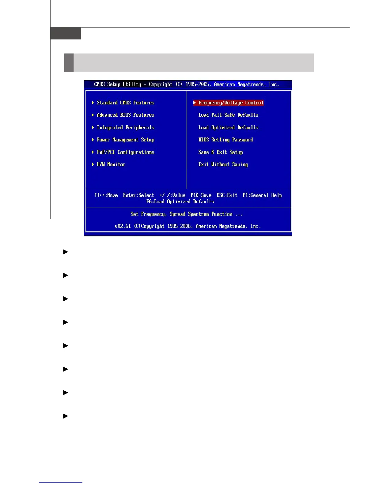 Use this menu to specify your settings for frequency/voltage control and overclocking.