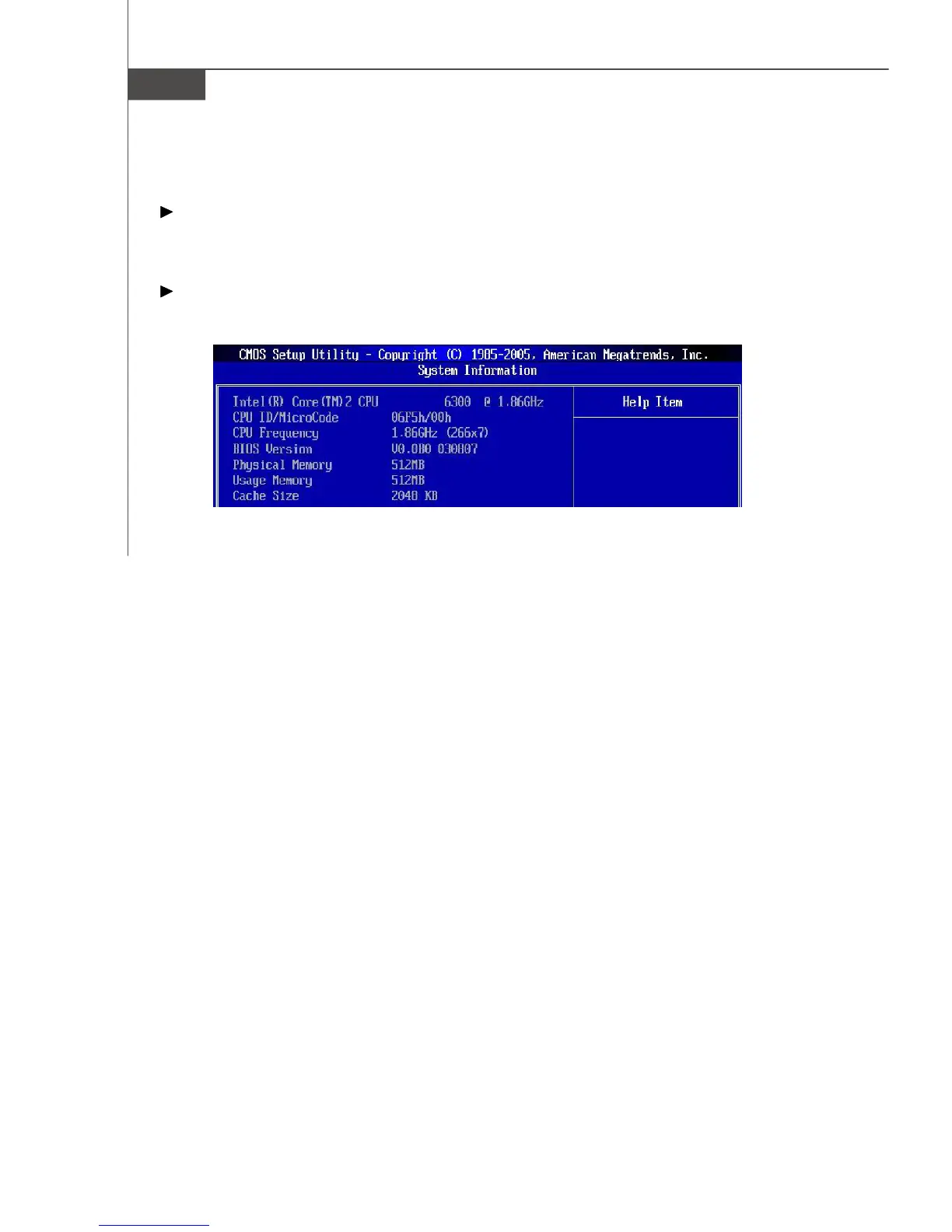 This sub-menu shows the CPU information, BIOS version and memory status of